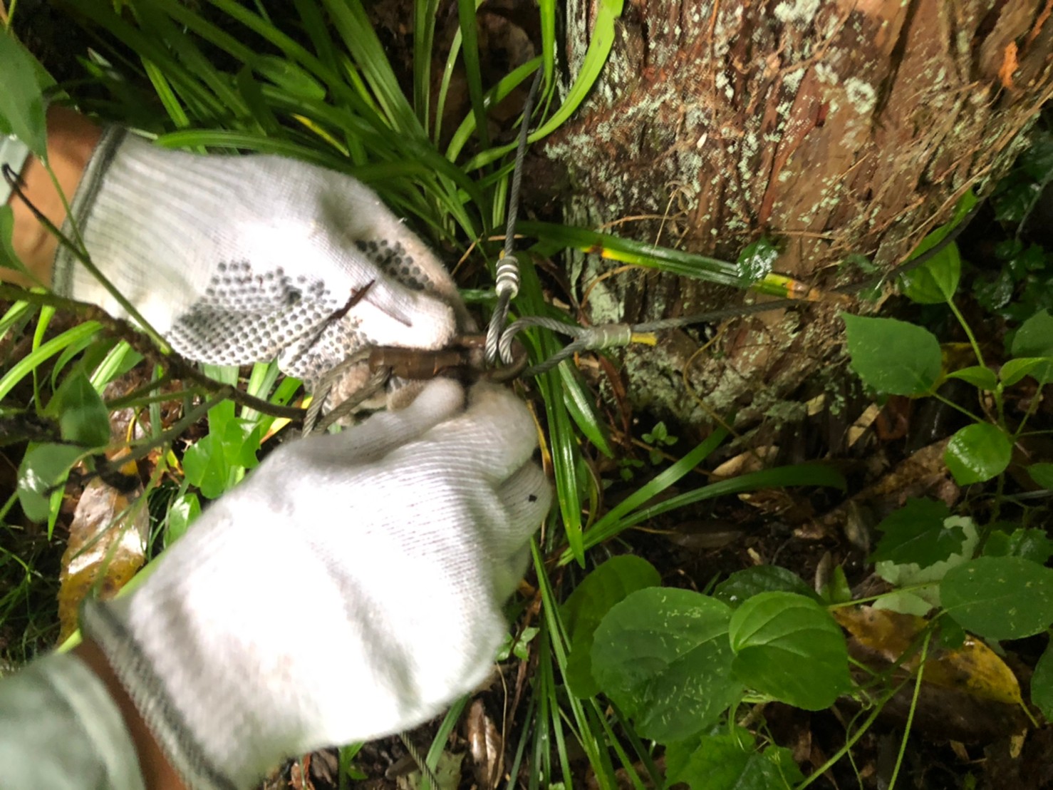 【今日の見回り】変化なし。おとといの罠設置の解説とあわせてどうゾ。 2020.06.27 0 5 0 以下、わなの設置の解説です。 今回は、写真向かって右の木の幹にワイヤーを巻き、その脇の獣道の斜面が終わるところに二つのくくり罠をかけました。 幹にワイヤーを巻く様子は、こちら。 そのあと、穴を掘ってわなのもう一端を設置します。 土と葉っぱをかぶせて見えないようにして、完了。 くくり罠がどのようなものかは、こちらの動画もご参考に↓ 2020.06.25くくり罠の威力実演。人間、怖っ。... 投稿者 マイわな① 神奈川県 コメント コメント ( 0 ) トラックバック ( 0 ) この記事へのコメントはありません。 この記事へのトラックバックはありません。 トラックバック URL 返信をキャンセルする。 名前 ( 必須 ) E-MAIL ( 必須 ) ※ 公開されません URL